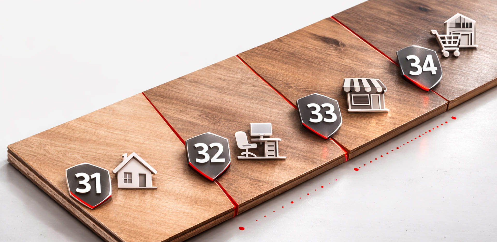 Когда говорят «класс ламината», обычно подразумевают его способность противостоять внешним воздействиям: ходьбе, передвижению мебели, падению предметов, воздействию грязи и влаги. В конце 90‑х годов Европейская ассоциация производителей ламинированных полов (EPLF) разработала единый стандарт EN 13329, который делит ламинат на классы в зависимости от результатов испытаний. Именно тогда появилась знакомая нам маркировка: первая цифра — область применения (2 — жилая, 3 — коммерческая), вторая — интенсивность нагрузки (от 1 до 4).