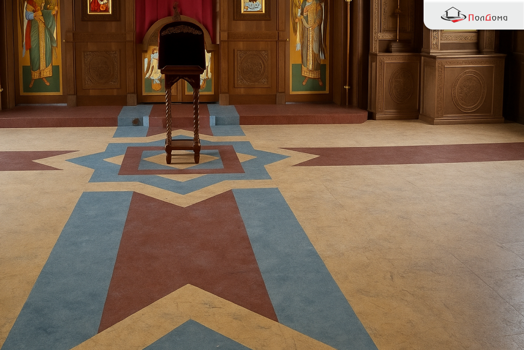 Монтаж выполнял строитель со стороны. Основанием послужила прочная фанера, обеспечивающая стабильность и ровность поверхности. Главным декоративным акцентом стала схема укладки с резкой и рисунком — индивидуальный узор, созданный специально под интерьер храма. Такое решение позволило подчеркнуть торжественность помещения и при этом сохранить практичность эксплуатации.